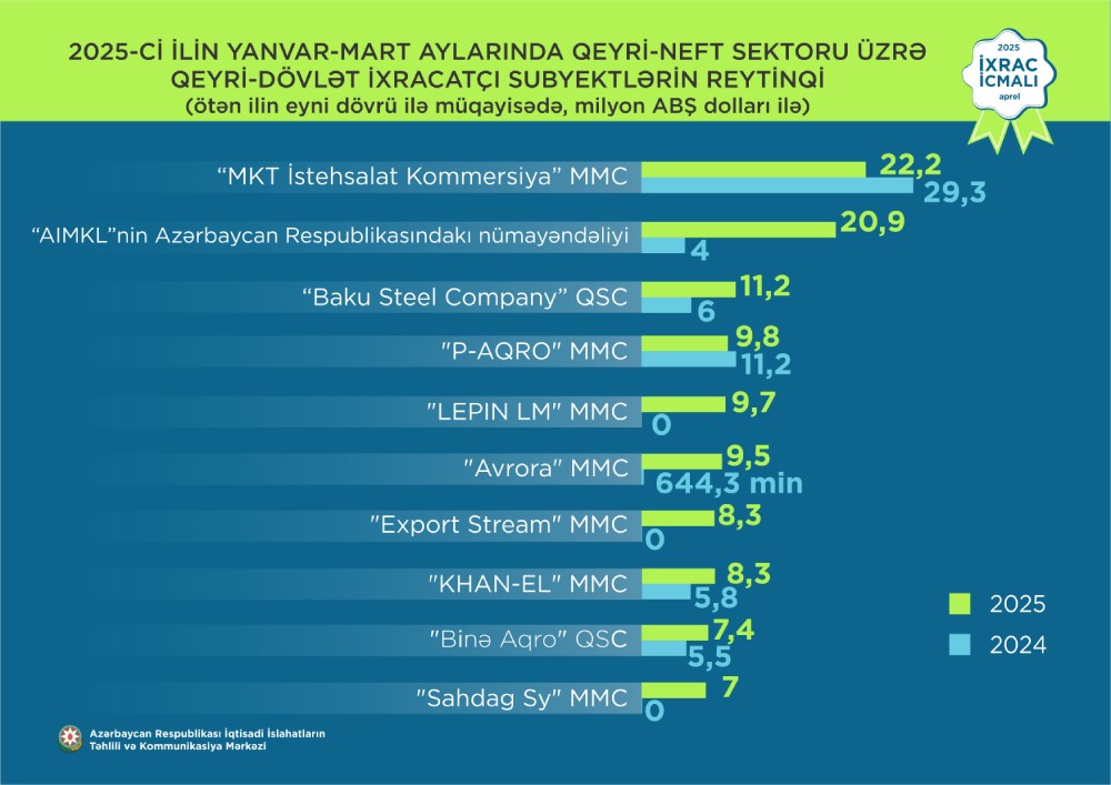 İqtisadi İslahatların Təhlili və Kommunikasiya Mərkəzinin paylaşdığı “İxrac icmalı”nın aprel siyahısında "Avrora Qrup" ilk sıralarda qərarlaşıb. Belə ki, Qrup, 2025-ci ilin yanvar-mart ayları üzrə hazırlanmış qeyri-dövlət ixracatçı subyektlərin reytinqində ilk onluqda 9,5 milyon dollarlıq ixrac məbləği ilə 6-cı yeri tutub. "Avrora Qrup" 2024-cü ilin enyi dövründə cəmi 644 min dollarlıq ixrac həyata keçirmişdi. Beləliklə, şirkətin ixracı bu ilin ilk rünüdə ötən ilin ilk rübü ilə müqayisədə 15 dəfə artıb.