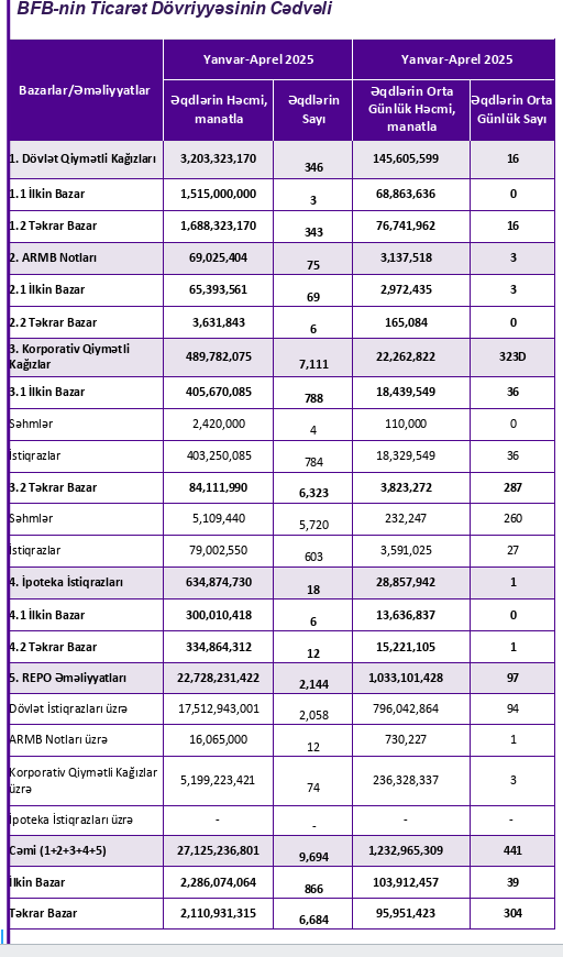 2025-ci ilin ilk 4 ayı (yanvar-aprel) ərzində Bakı Fond Birjasında (BFB) ticarət dövriyyəsinin həcmi 27 milyard 125 milyon 237 min manat təşkil edib.