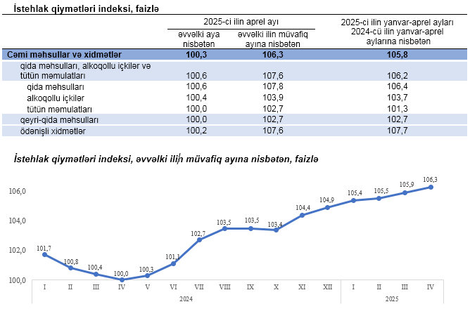 2025-ci ilin aprel ayında istehlak qiymətləri indeksi əvvəlki aya nisbətən 0,3 faiz, yanvar-aprel aylarında isə əvvəlki ilin müvafiq dövrünə nisbətən 5,8 faiz yüksəlib.