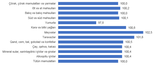 Cari ilin aprel ayında əvvəlki aya nisbətən ayrı-ayrı qida məhsullarından daha çox bahalaşma manna yarmasının, süfrə marqarininin, kərə, günəbaxan və qarğıdalı yağlarının, limonun, portağalın, bananın, almanın, armudun, brokkolinin, şirin bibərin, süfrə çuğundurunun, soğanın, kartofun, qəhvənin, kakaonun, qazlı və qazsız suların, ucuzlaşma isə unun, qarabaşaq yarmasının, yumurtanın, qozun, fındığın, şabalıdın, kələmin, göyərtinin, xiyarın, sarımsağın qiymətlərində müşahidə olunmuşdur. Digər qida məhsullarının qiymətlərində ciddi dəyişikliklər baş verməmişdir.