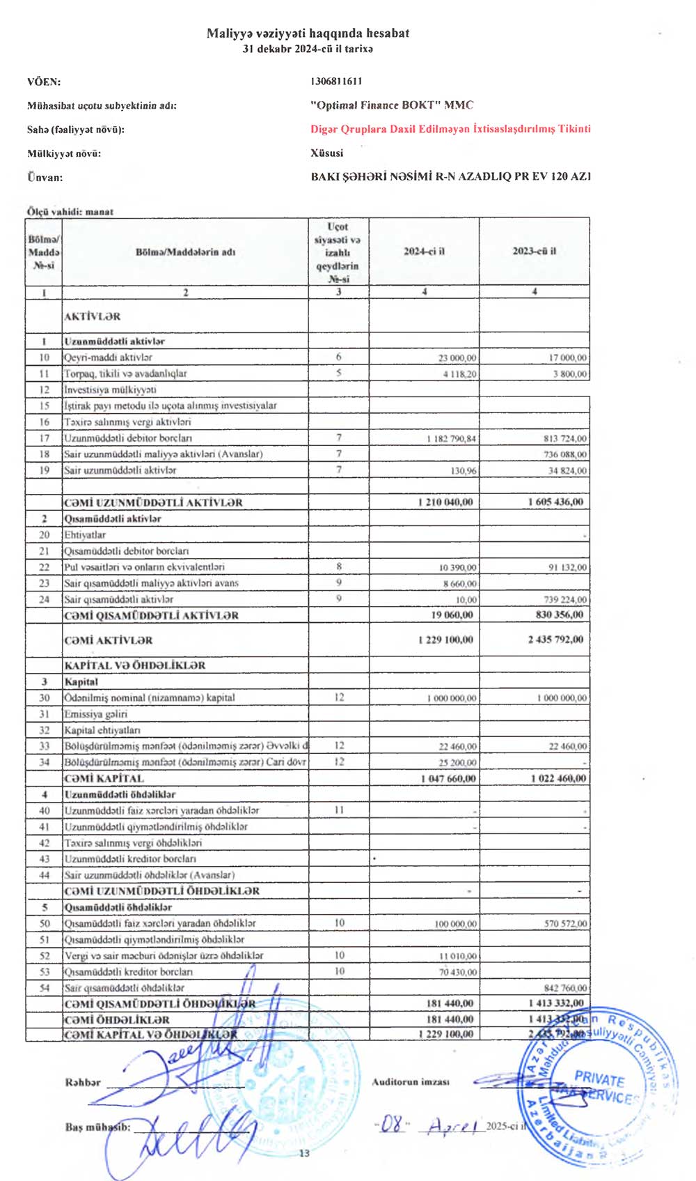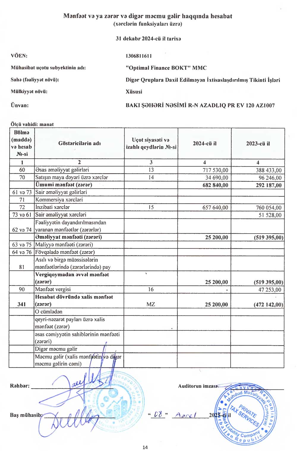 "Optimal Finance Bank Olmayan Kredit Təşkilatı" MMC 2024-cü ili 25 min 200 manat xalis mənfəət ilə başa vurub. Təşklat 2023-cü ili 472 min 142 manat xalis zərər ilə bağlamışdı. Gəlirləri artdığından "Optimal Finance" ötən ildən mənfəətlə işləməyi bərpa edib.