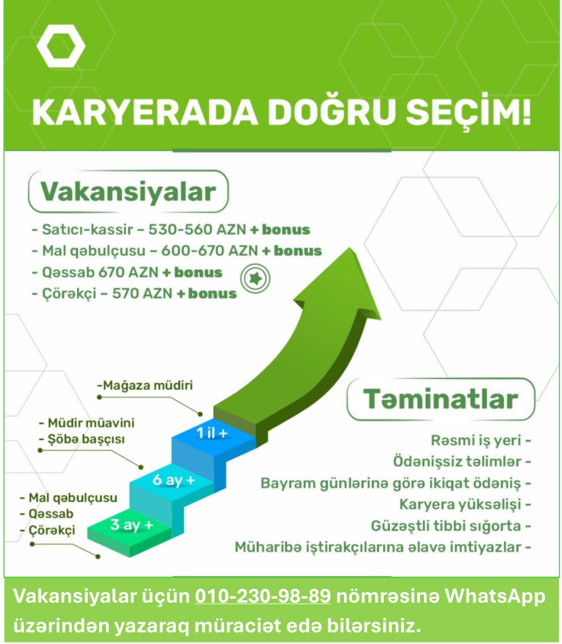 Vakansiyalar üçün 010 230 98 89 Telefon/Vatsap nömrəsinə müraciət edə bilərsiniz (Vatsap aktivdir). Whatsapp (Vatsap) daim aktivdir.