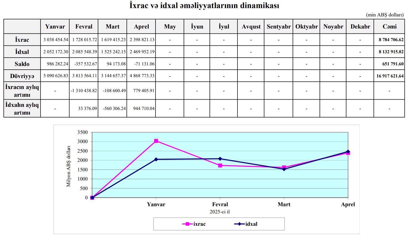 2025-ci ilin ilk 4 ayı ərzində (yanvar-aprel) Azərbaycanın xarici ticarət əməliyyatlarının həcmi 16 milyard 917 milyon 622 min dollar təşkil edib.