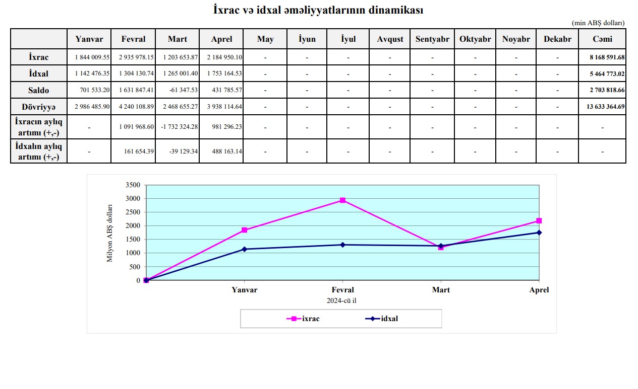 Xatırladaq ki, 2024-cü ilin ilk 4 ayı ərzində Azərbaycanın xarici icarәt әmәliyyatlarının hәcmi 13 milyard 633 milyon 365 min dollar, o cümlәdәn, ixrac 8 milyard 168 milyon 592 min dollar, idxal 5 milyard 464 milyon 773 min dollar, müsbət saldo 2 milyard 703 milyon 819 min dollar olmuşdu.