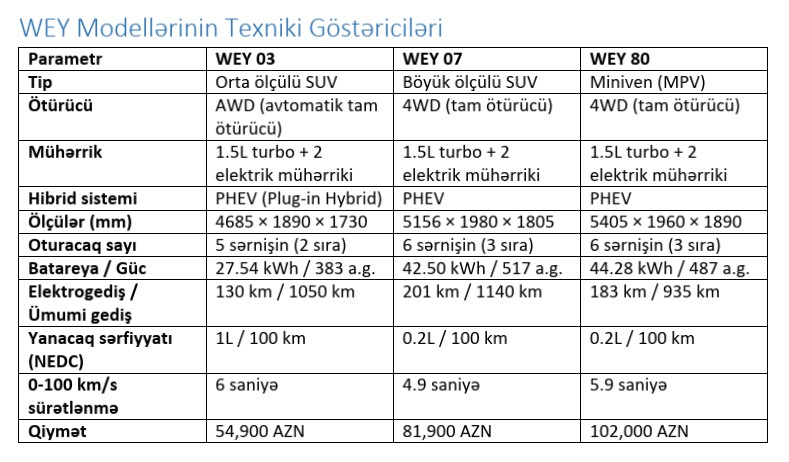 “WEY brendinin ölkəmizdə satışa çıxması Azərbaycan avtomobil sektorunda əlamətdar hadisədir. Biz fəxrlə təqdim edirik ki, bu avtomobillər həm dizayn, həm də texnologiya baxımından ən yüksək standartlara cavab verir. Müştərilərimiz premium Avropa sinfinə uyğun komfort və təhlükəsizlik səviyyəsini artıq burada əldə edə biləcəklər.”