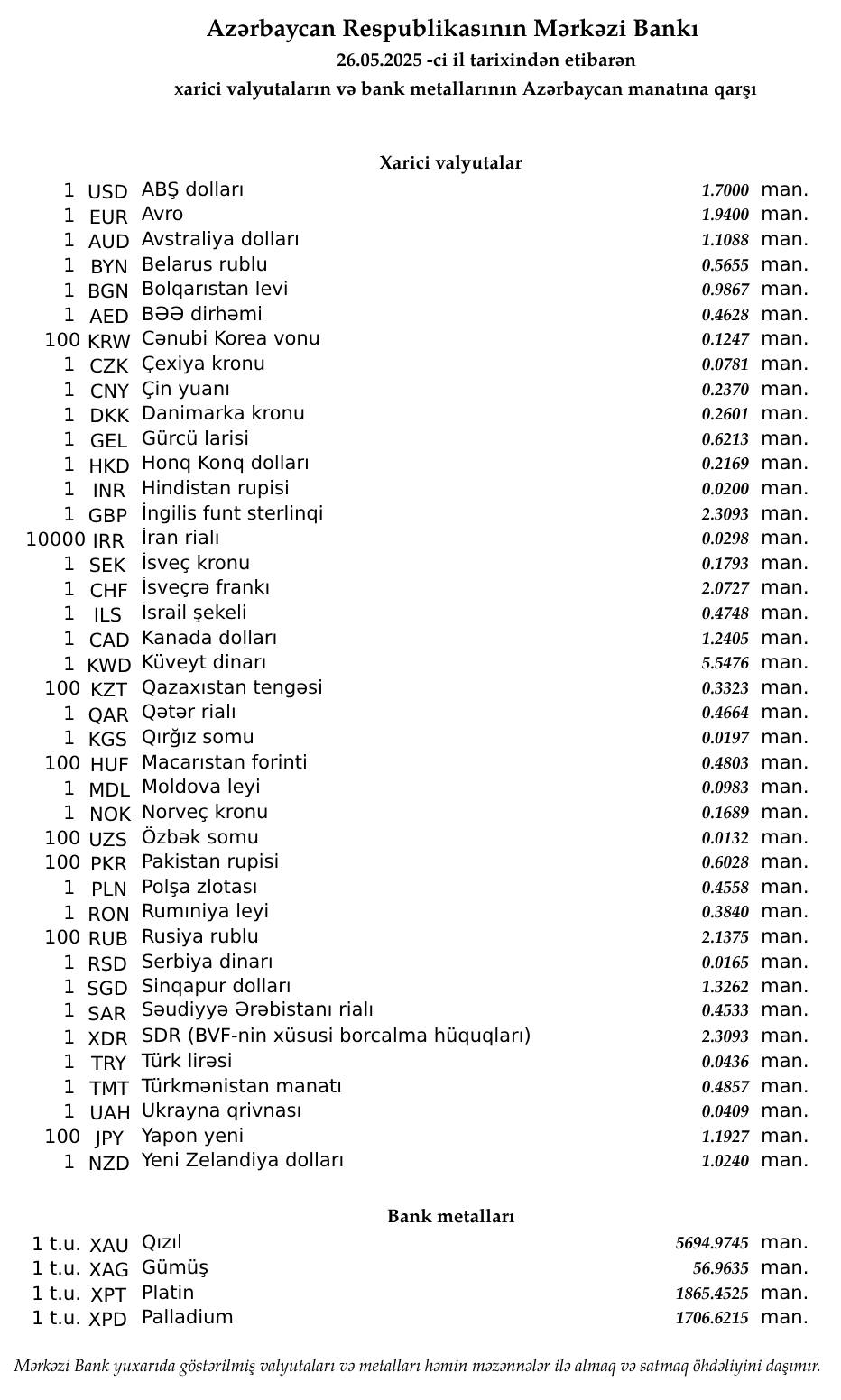 Dolların bazar ertəsi üçün rəsmi məzənnəsi müəyyən olunub
