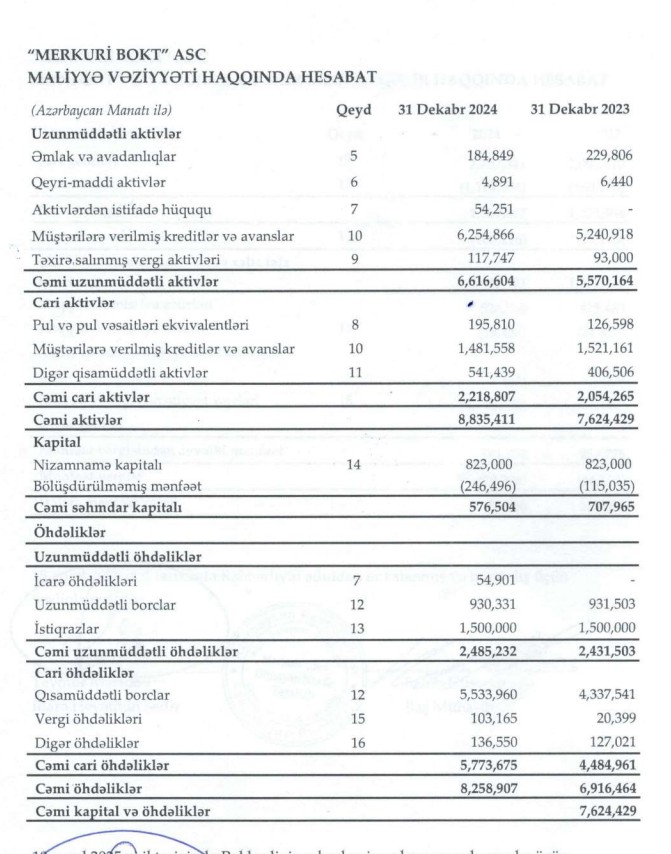 2024-cü ildə "Merkuri BOKT"ın kredit portfeli (müştərilərə verilmiş kreditlər) 1 milyon 14 min manat və ya 19,3% artaraq 31 dekabr 2024-cü il tarixində 6 milyon 255 min manata çatıb.