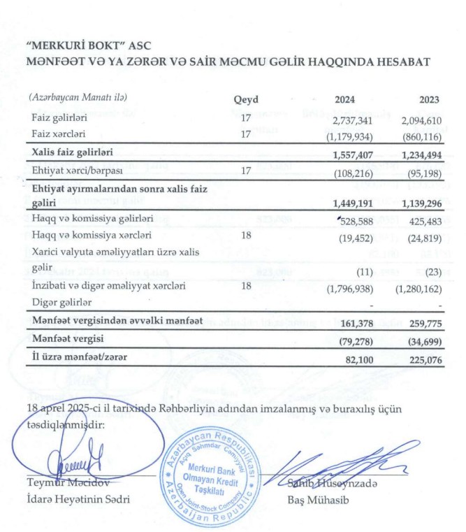 Marja.az təşkilatın maliyyə hesabatlarına istinadən xəbər verir ki, "Merkuri BOKT"ın faiz gəlirləri 2023-cü ildə 2 milyon 95 min manat, haqq və komissiya gəlirləri 425 min manat ikən, 2024-cü ildə müvafq olaraq 2 milyon 737 min manata və 528 min manata yüksəlib.