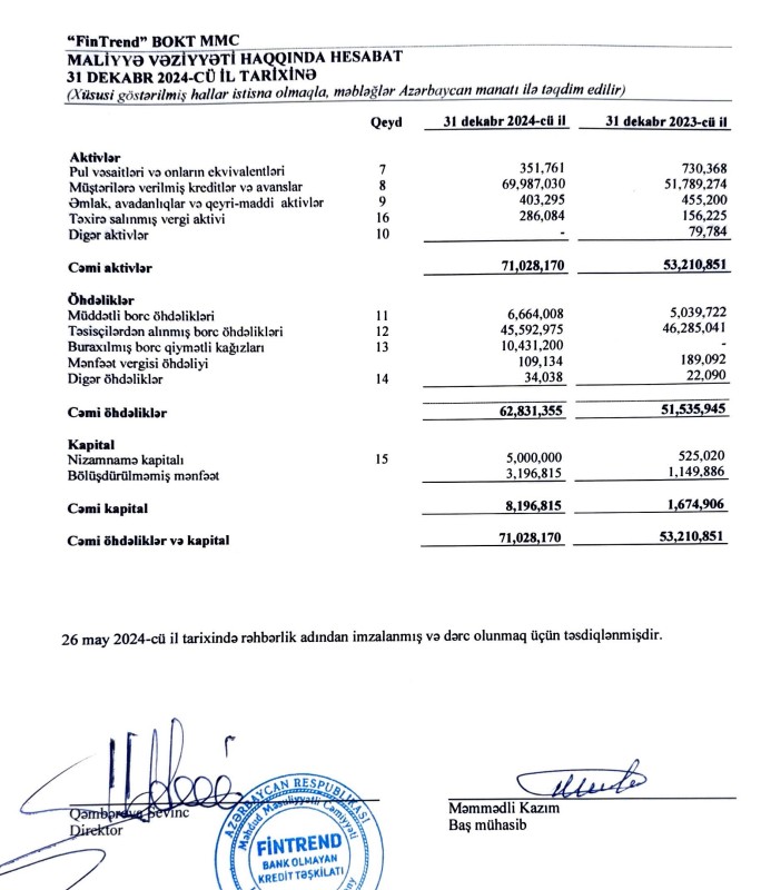 Ötən il "Fin Trend" BOКТ-ın kredit portfeli (müştərilərə verilmiş kreditlər) 18 milyon 198 min manat və ya 35,1% artaraq 31 dekabr 2024-cü il tarixində 69 milyon 987 min manata çatıb.