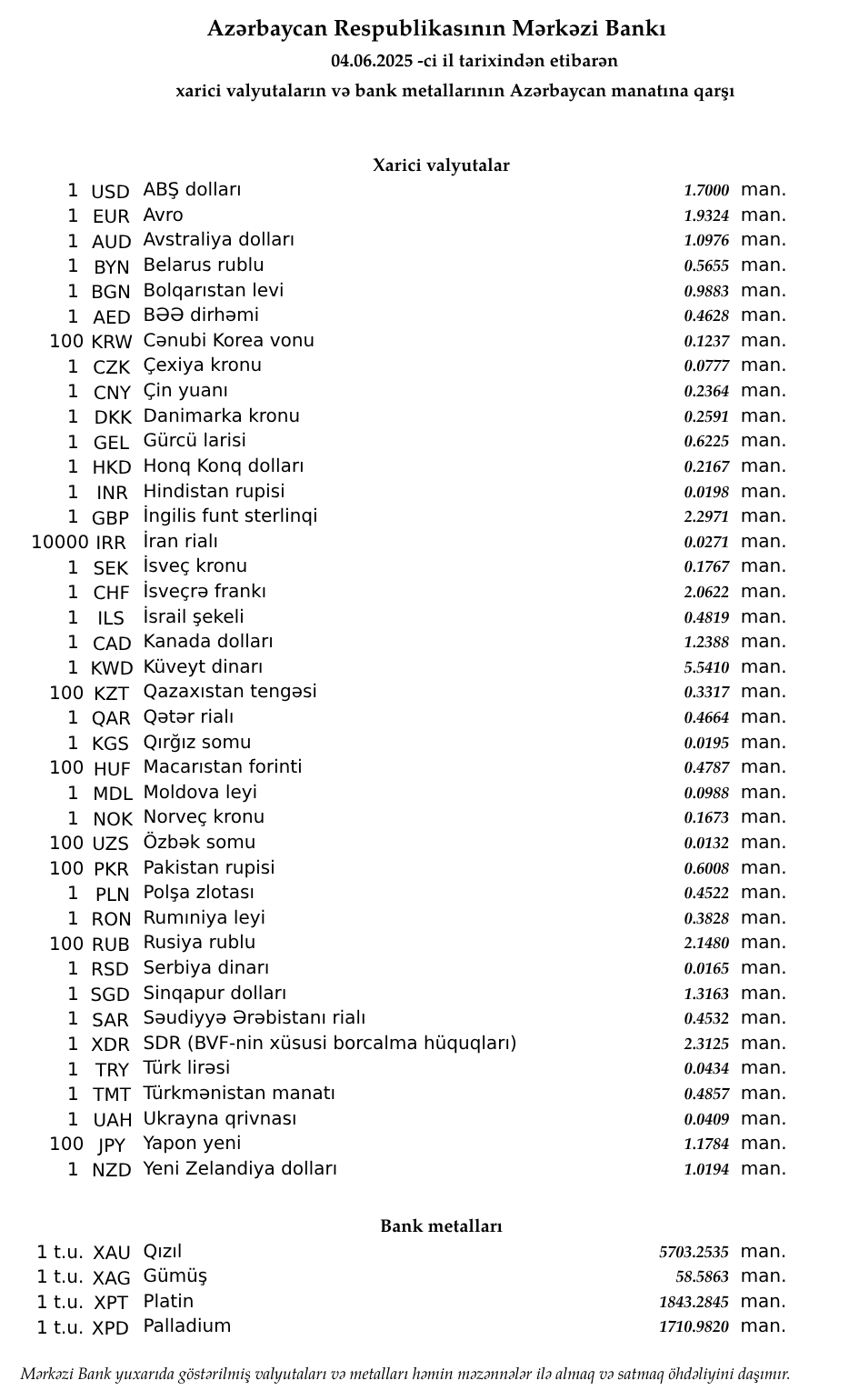Rəsmi məzənnələr açıqlandı