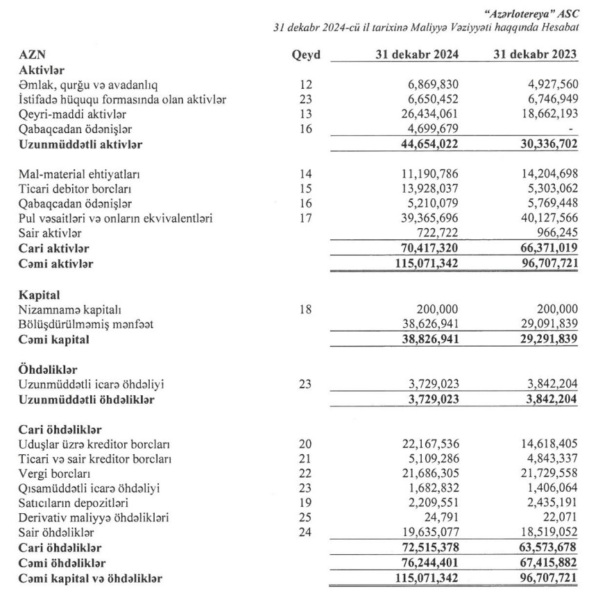 Eyni zamanda, 2023-cü ildə "Azərlotereya" 1 milyon 596 min manat maliyyə gəliri əldə edib (2023-də 955 min manat).