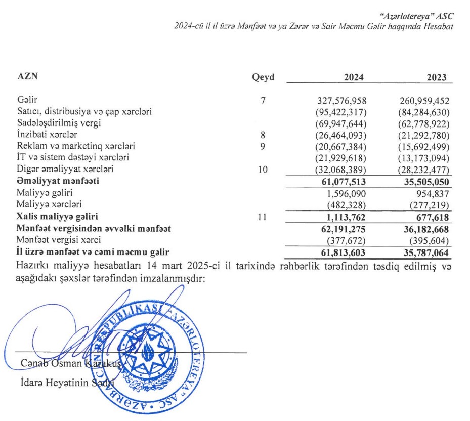 "Azərlotereya" ASC 2024-cü ili 61 milyon 814 min manat xalis mənfəət ilə başa vurub. Şirkət 2023-cü ili 35 milyon 787 min manat xalis mənfəət ilə bağlamışdı. Beləliklə, "Azərlotereya"nın 2024-cü ildə xalis mənfəəti 2023-cü illə müqayisədə 26 milyon 27 min manat və ya 72,7% artıb.