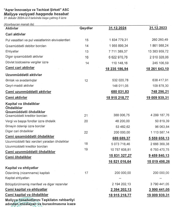 Xatırladaq ki, "Aqrar İnnovasiya və Təchizat Şirkəti” ASC 2022-ci ili 1 milyon 428 min manat xalis mənfəət ilə başa vurmuşdu. Şirkətin xalis mənfəəti 2021-ci illə müqayisədə 2022-ci ildə 1 milyon 22 min manat və ya 41,7% azalmışdı. Şirkət 2021-ci ili 2 milyon 450 min manat xalis mənfəət ilə bağlamışdı. 2020-ci ildə isə "Aqrar İnnovasiya və Təchizat Şirkəti”nin xalis mənfəəti 3 milyon 439 min manat olmuşdu.