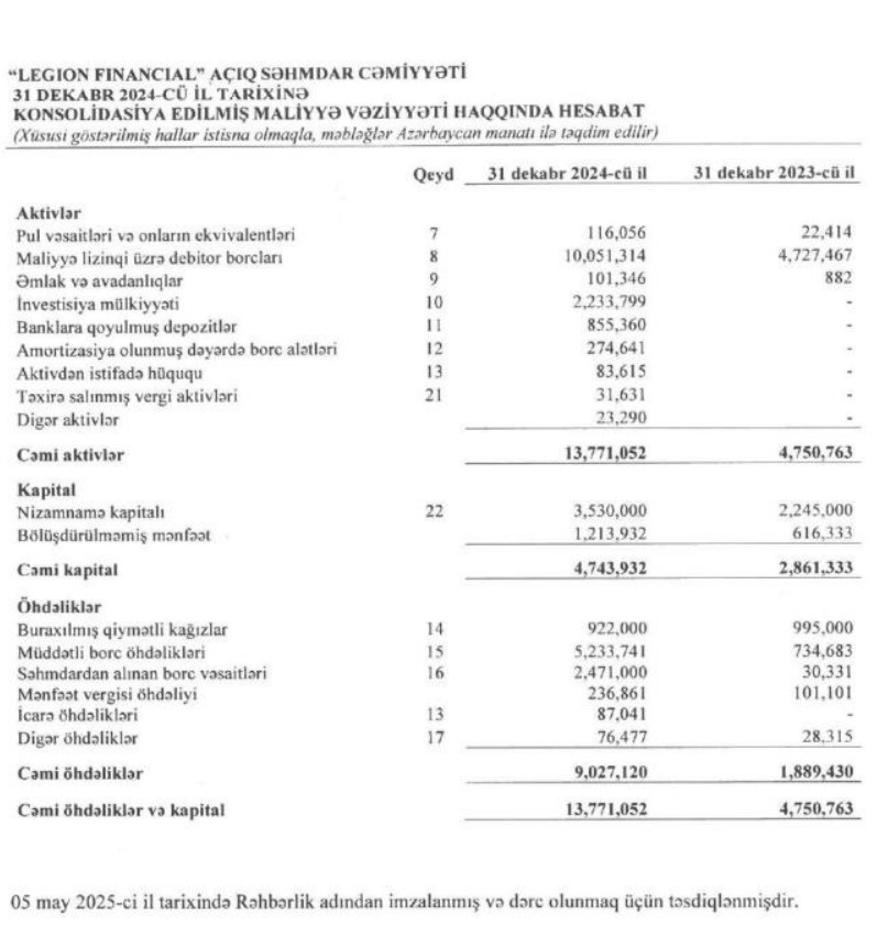 Ötən il "Legion Financial"ın lizinq portfeli 2 dəfədən çox artaraq 2023-cü ilin sonundakı 4 milyon 727 min manatdan 31 dekabr 2024-cü il tarixində 10 milyon 51 min manata yüksəlib.