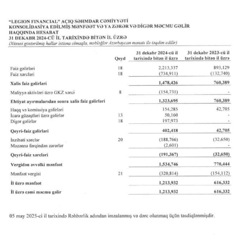 Marja.az Şirkətin maliyyə hesabatlarına istinadən xəbər verir ki, "Legion Financial"ın faiz gəlirləri 2023-cü ildə 893 min manat ikən, 2024-cü ildə 2 milyon 213 min manata yüksəlib (1 milyon 320 min manat və ya 1,5 dəfə artıb). Şirkətin qeyri-faiz gəlirləri isə 43 min manatdan 402 min manata yüksəlib (9,3 dəfə artıb).