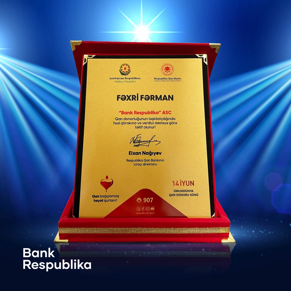 Bank Respublika qan donorluğunun inkişafına verdiyi töhfəyə görə mükafatlandırıldıÖlkəmizdə çoxsaylı sosial layihələr həyata keçirən, respublikanın aparıcı banklarından biri olan Bank Respublika, növbəti dəfə mükafata layiq görülüb.