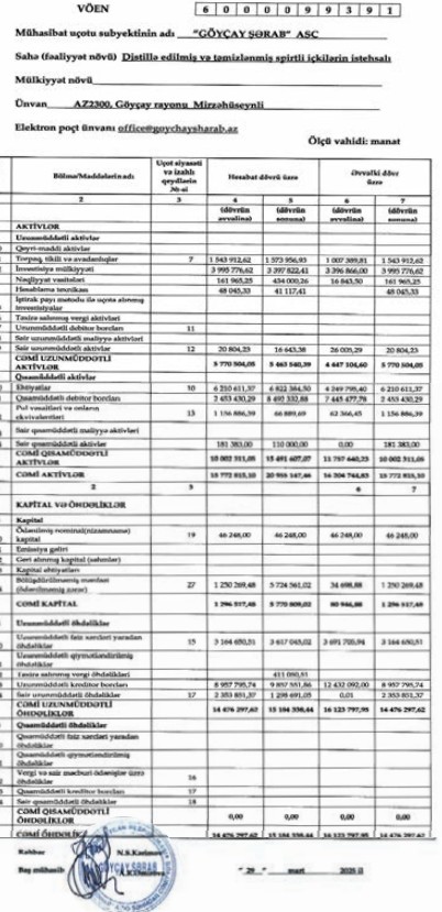 31 Dekabr 2024-cü il tarixində "Göyçay Şərab" ASC 15 milyon 773 min manat cəmi aktivlərə malik olub. Şirkət 2023-cü ilin sonunda 14 milyon 205 min manat cəmi aktivlərə malik idi.