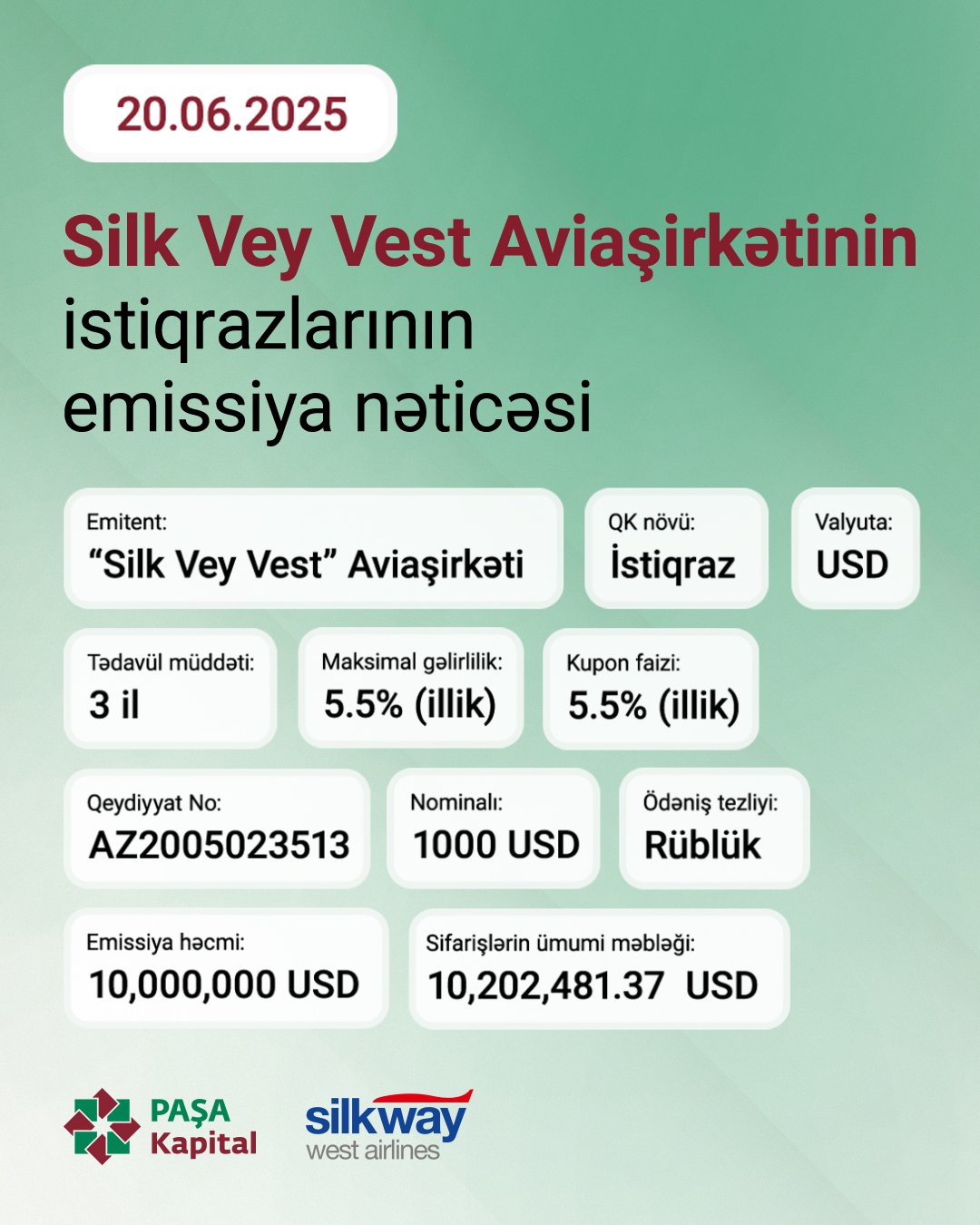 İnvestorlar illik 5.5%-dək gəlir qazanacaqlar.20 iyun 2025-ci il tarixində Bakı Fond Birjasında PAŞA Kapital-ın anderrayterliyi ilə Silk Vey Vest Aviaşirkətinə məxsus 10 milyon ABŞ dolları dəyərində istiqrazların II tranşı üzrə yerləşdirilməsi uğurla yekunlaşıb.