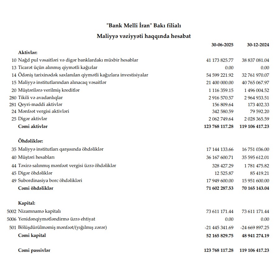 2024-cü ilin sonu ilə müqayisədə 2025-ci ilin ilk 6 ayında "Bank Melli İran" Bakı filialının cəmi aktivləri 4 milyon 662 min manat və ya 3,4% artaraq 30 iyun 2025-ci il tarixində 123 milyon 768 min manata çatıb. Filialın qiymətli kağızlara investisiyaları 21 milyon 837 min manat və ya 66,6% artaraq 54 milyon 599 min manata yüksəlib. Maliyyə institutlarından alınacaq vəsaitlər isə 47,5% azalaraq 21 milyon 400 min manata düşüb.