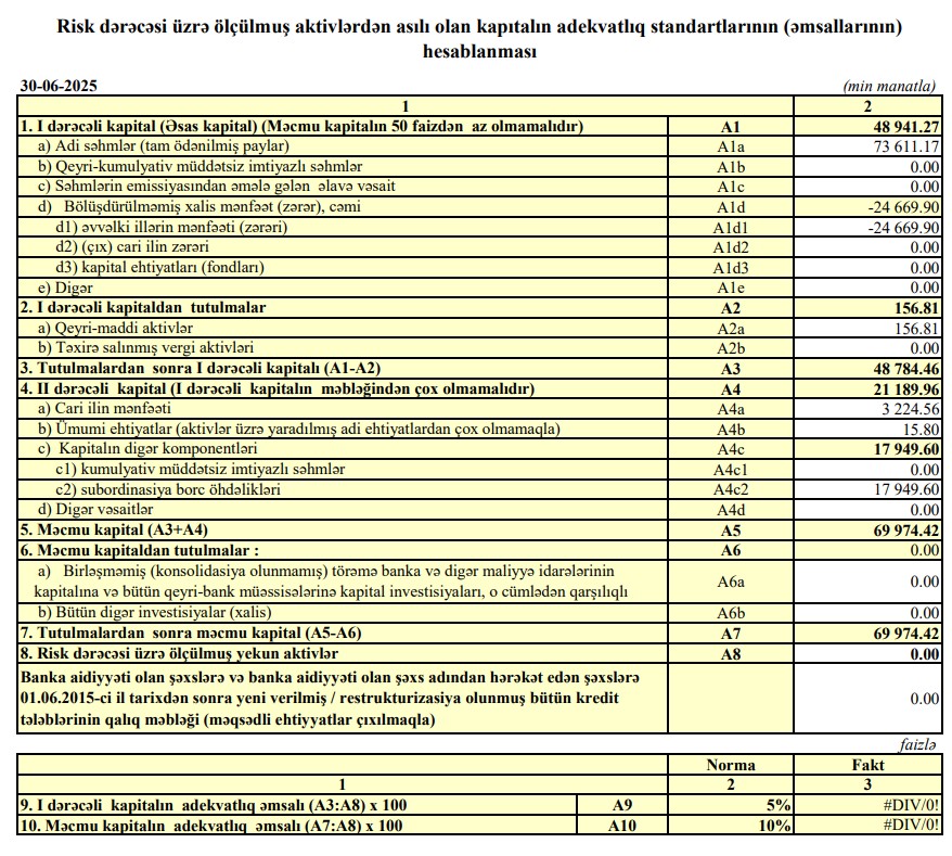 30 iyun 2025-ci il tarixində "Bank Melli İran" Bakı filialı 69 milyon 974 min manat məcmu kapitala malik olub.