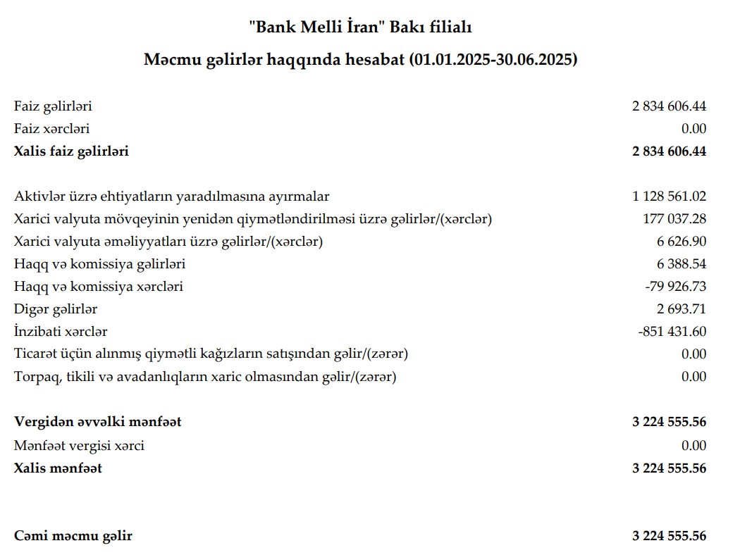 "Bank Melli İran" Bakı filialı 2025-ci ilin ilk 6 ayını (yanvar-iyun) 3 milyon 224 min manat xalis mənfəət ilə başa vurub. Filial 2024-cü ilin ilk 6 ayını 3 milyon 437 min manat xalis mənfəət ilə bağlamışdı. Xalis mənfəətin 212 min manat azalması aktivlər üzrə ehtiyatların yaradılmasına ayırmalardan qayıdan vəsaitin azalması ilə əlaqədardır. Cari ilin ilk yarısında Filailın faiz gəlirləri artıb.