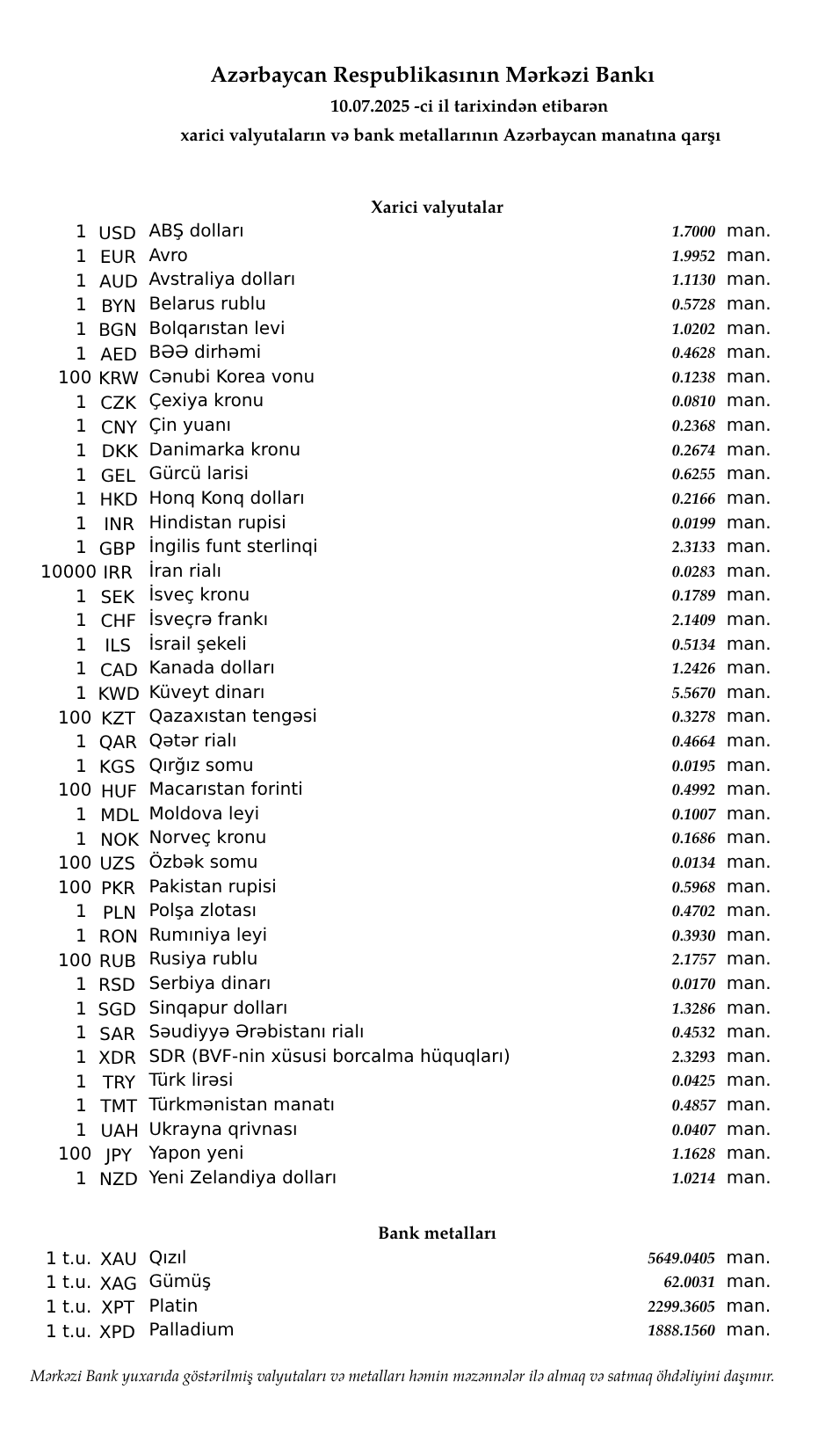 Dolların bazar ertəsi üçün rəsmi məzənnəsi müəyyən olunub