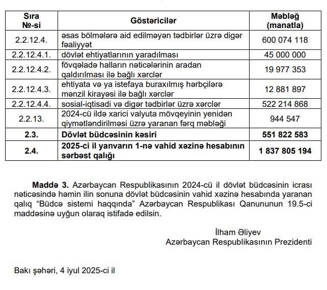 Prezident İlham Əliyev "Azərbaycan Respublikasının 2024-cü il dövlət büdcəsinin icrası haqqında" Azərbaycan Respublikasının Qanununu imzalayıb.