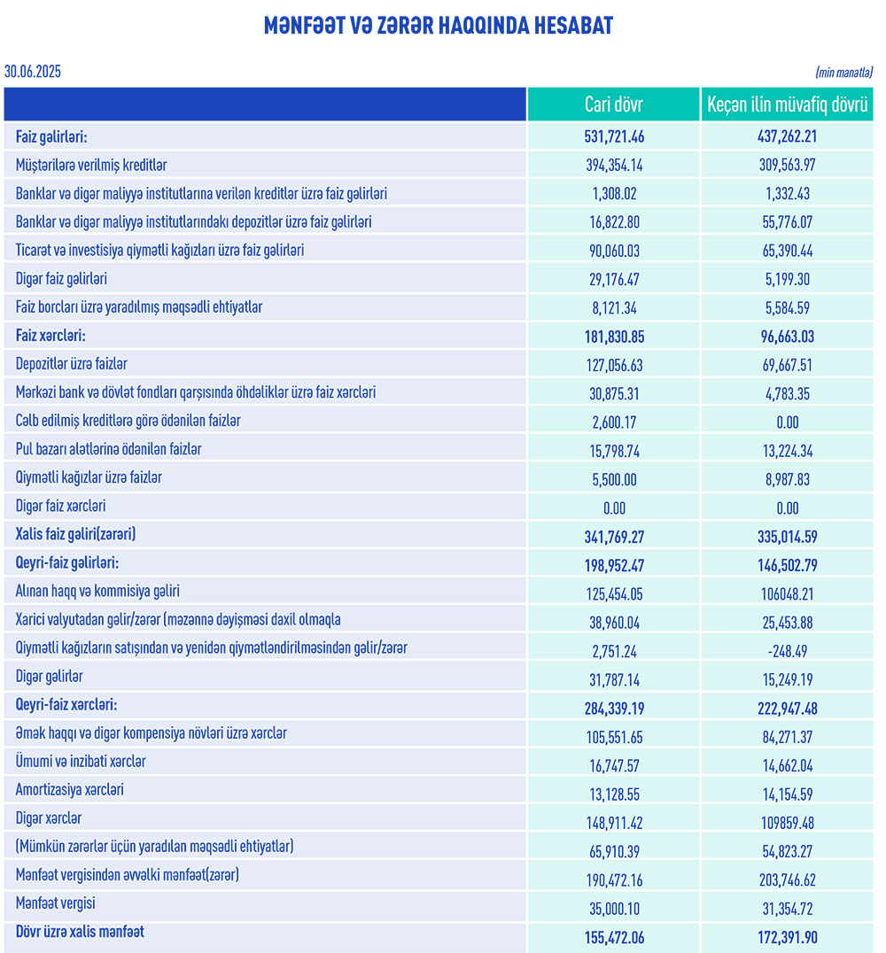 Aktivlərinin həcminə görə Azərbaycanın ən böyük bank olan “Azərbaycan Beynəlxalq Bankı” ASC (ABB) 2025-ci ilin 1-ci yarısını (yanvar-iyun) 155 milyon 472 min manat xalis mənfəətlə başa vurub. Bank 2024-cü ilin eyni dövrünü 172 milyon 392 min manat xalis mənfəətlə bağlamışdı.
