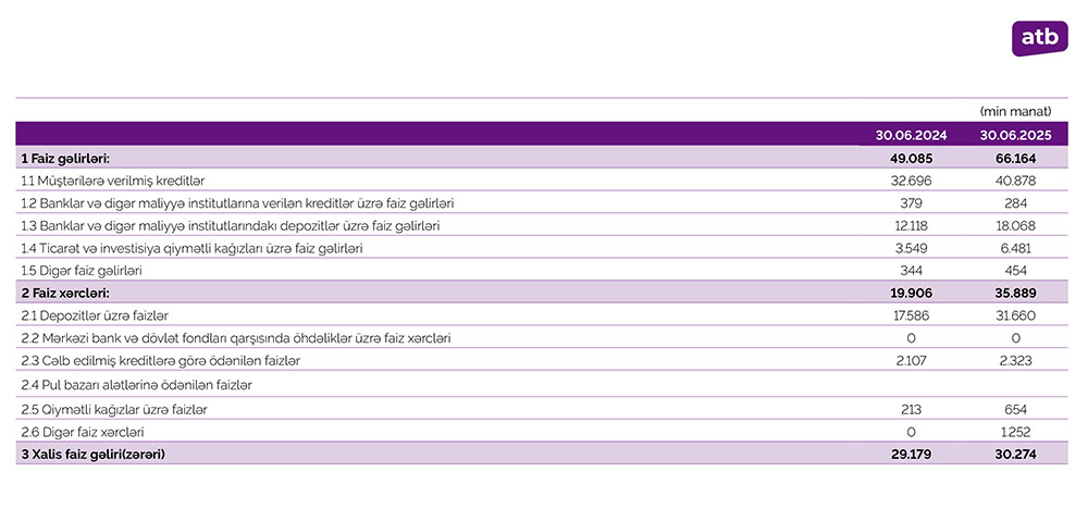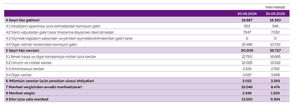 2025-ci ilin birinci yarım ili ərzində Bankın gəlirləri keçən ilin eyni dövrü ilə müqayisədə 24, 3% yüksəlməklə 84,5 milyon manat, xərcləri 77,5 milyon manat olmuşdur.