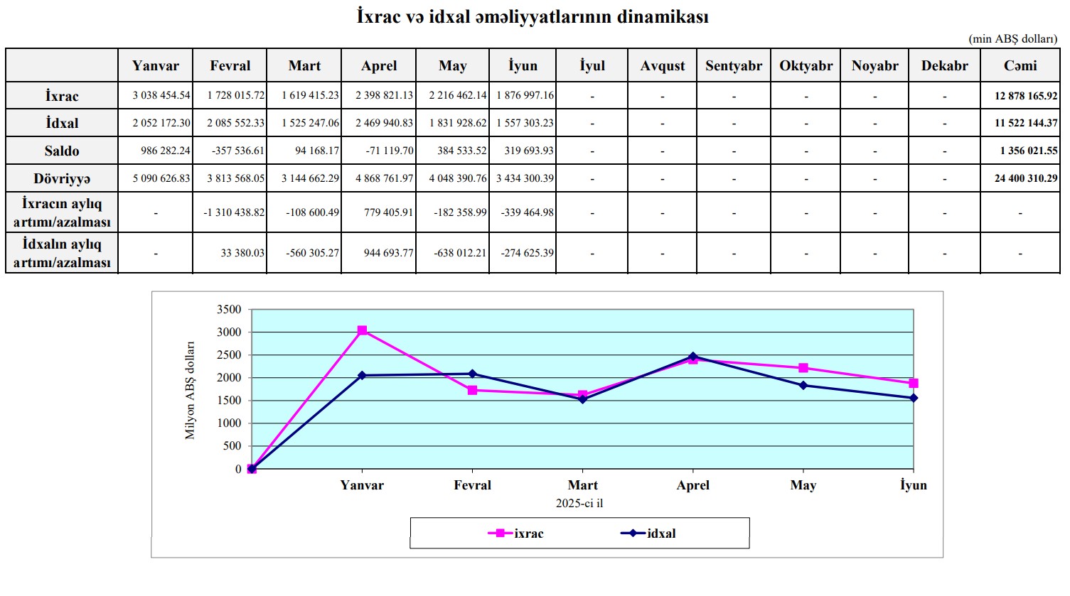 2025-ci ilin ilk 6 ayında Azərbaycanın idxalı 2 milyard 654 milyon 943 milyon dollar artarkən, ixracı 22 milyon 814 min dollar azalıb. Bu səbəbdən müsbət saldoda 3 dəfə və ya 2 milyard 677 milyon 757 min dollar azalma baş verib.