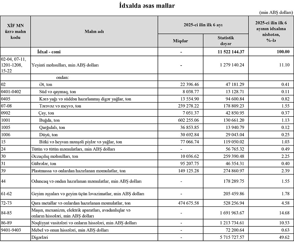 2025-cü ilin yanvar-iyun aylarında (ilk 6 ayda) Azərbaycanın ən çox ixrac və idxal etdiyi mallar.