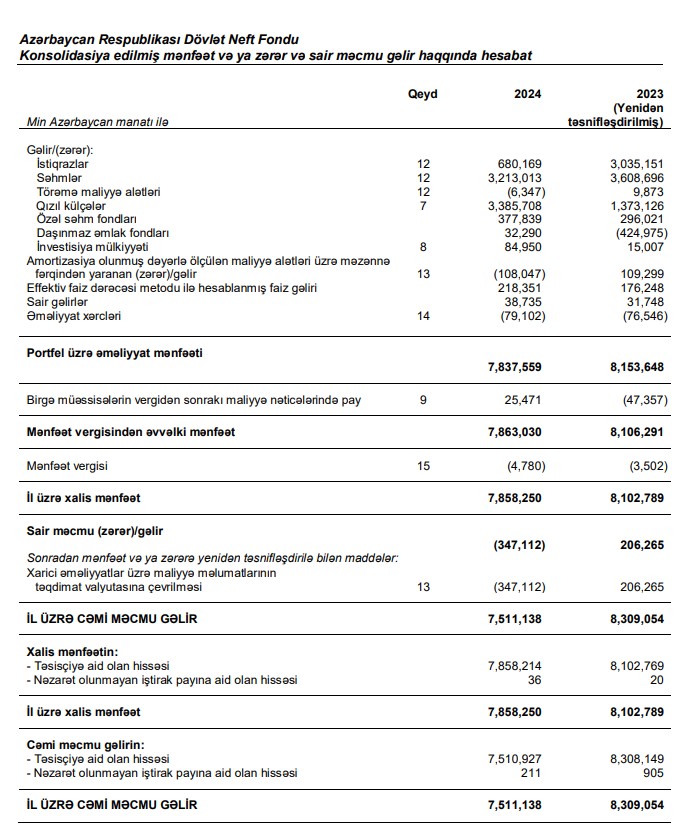 Marja.az ARDNF-in konsolidasiya edilmiş mənfəət və ya zərər və sair məcmu gəlir haqqında hesabatına istinadən xəbər verir ki, Fondun istiqrazlara investisiylarından gəliri 4,5 dəfə azalıb, qızıla investisiyalarından gəlir isə 2,5 dəfə artıb.