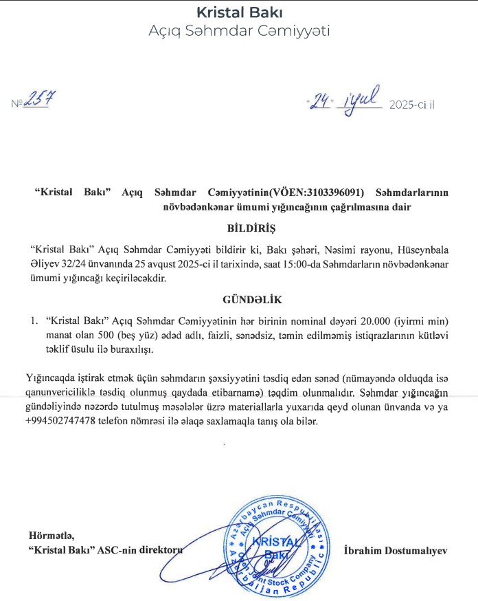 Marja.az xəbər verir ki, 25 avqust 2025-ci il tarixində "Kristal Bakı" ASC səhmdarlarının növbədənkənar ümumi yığıncağı keçiriləcək.