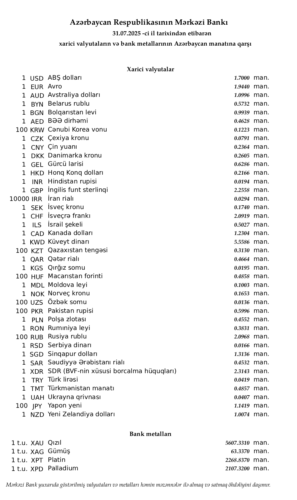 Dolların bazar ertəsi üçün rəsmi məzənnəsi müəyyən olunub
