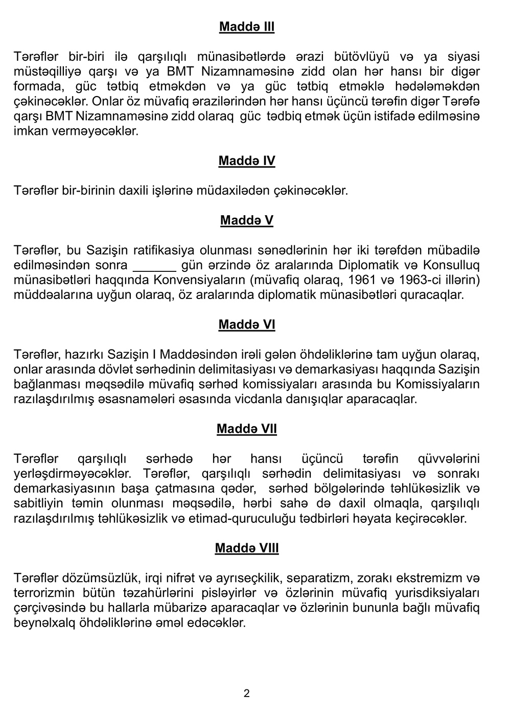 Tərəflər, I Maddəyə tam riayət etməklə, bir-birinə qarşı hər hansı ərazi iddialarının olmadığını və gələcəkdə belə iddialar qaldırılmayacağını təsdiq edirlər;
