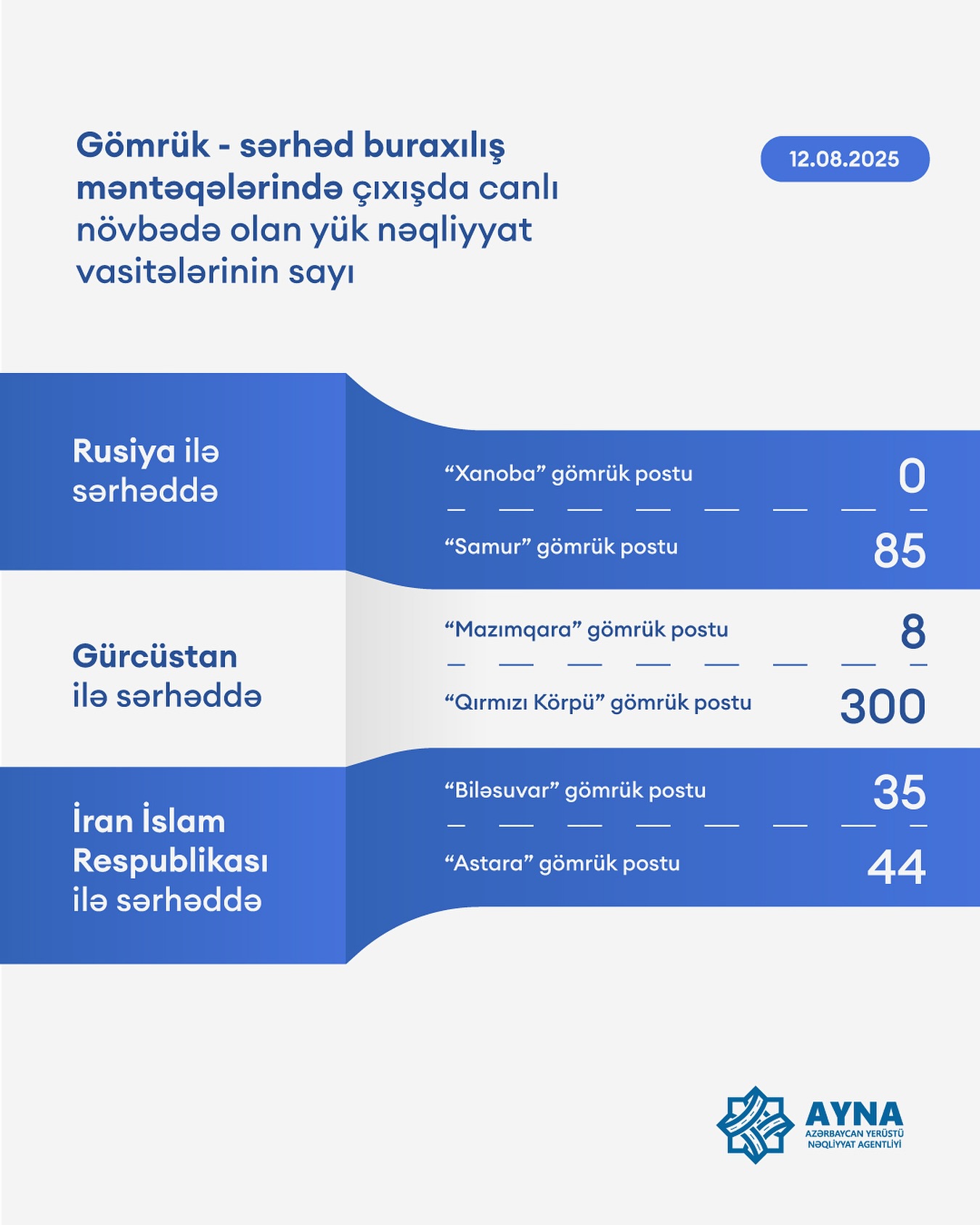 Qeyd edilib ki, Gürcüstan ilə sərhəddə 308 avtomobil, Rusiya ilə sərhəddə 85 avtomobil, İran ilə sərhəddə 79 avtomobil növbə gözləyir.