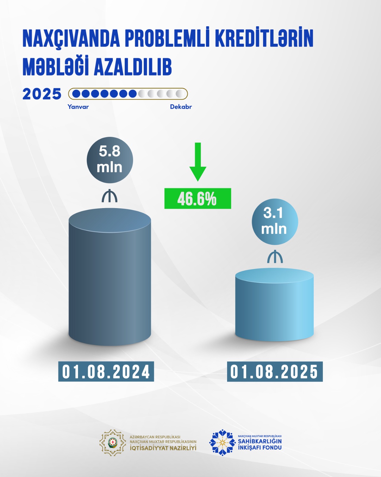 Sahibkarlığın İnkişafı Fonduna öhdəlik olaraq vaxtında qaytarılmalı, lakin qaytarılması təmin edilməyən vaxtı keçmiş kreditlərin məbləği 1 avqust 2024-cü il tarixə 5,8 milyon manatdan 2025-ci il 1 avqust tarixinə 2,7 milyon manat və ya 46,6 faiz azalaraq 3,1 milyon manata endirilib.