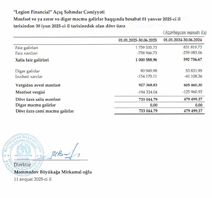 Marja.az xəbər verir ki, "Legion Financial" faiz gəlirləri 2024-cü ilin 1-ci yarısında 832 min manat ikən, 2025-ci ilin 1-ci yarısında 1 milyon 760 min manat təşkil edib (2,1 dəfə artıb).