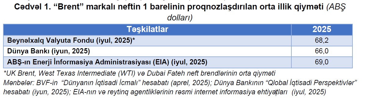Dünya Bankı (DB) isə 2025-ci ilin iyun ayında qlobal iqtisadi artım üzrə əvvəlki proqnozunu 0,4 faiz bənd azaldaraq 2,3 faiz səviyyəsində qiymətləndirmişdir. Beynəlxalq maliyyə institutları və agentliklərinin son proqnozlarına əsasən, xam neftin bir barelinin orta illik satış qiymətinin 66-69 ABŞ dolları civarında olacağı proqnozlaşdırılır (Cədvəl 1).
