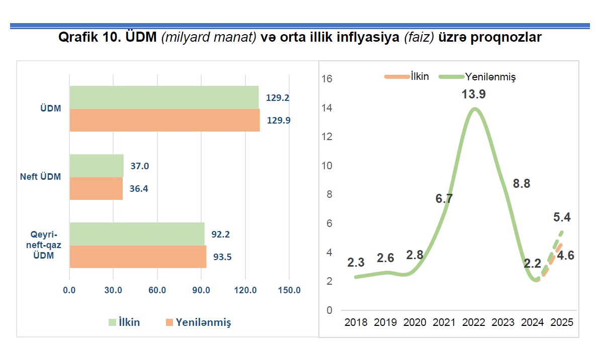 Yuxarıda qeyd olunan qlobal və regional iqtisadi reallıqlar, xüsusilə də dünya enerji, ərzaq və maliyyə bazarlarında baş verən proseslər milli iqtisadiyyata da təsirsiz ötüşməmişdir və İqtisadiyyat Nazirliyi tərəfindən bir sıra proqnozların yenilənməsini zəruri etmişdir. Belə ki, 2025-ci ilin ilk 6 ayında qeydə alınmış makro-fiskal nəticələr, həmçinin qlobal miqyasda iqtisadi artımla və enerji daşıyıcılarının qiymətləri ilə bağlı gözləntilər fonunda cari ildə ölkə iqtisadiyyatı ilə bağlı makroiqtisadi proqnozlar yenilənmişdir. Həmin proqnozlara əsasən, 2025-ci ildə ÜDM-in real artımı 3 faiz olmaqla nominal ifadədə 129,9 milyard manata (dövlət büdcəsinin layihəsinin tərtibi zamanı təqdim edilmiş proqnoza nəzərən 0,7 milyard manat çox), o cümlədən qeyri-neft ÜDM 93,5 milyard manata (əvvəlki proqnoza nəzərən 1,3 milyard manat çox) çatacağı gözlənilir.