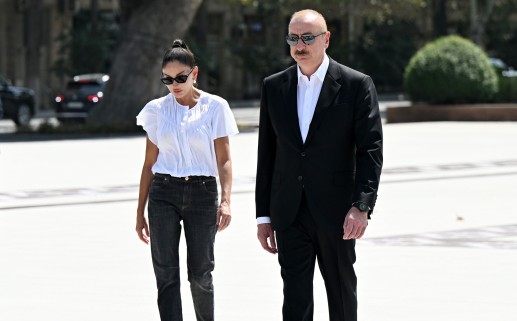 Dövlətimizin başçısı və birinci xanım Ulu Öndər Heydər Əliyevin şəhərin mərkəzində ucaldılan abidəsini ziyarət edərək, önünə gül dəstələri qoyublar.