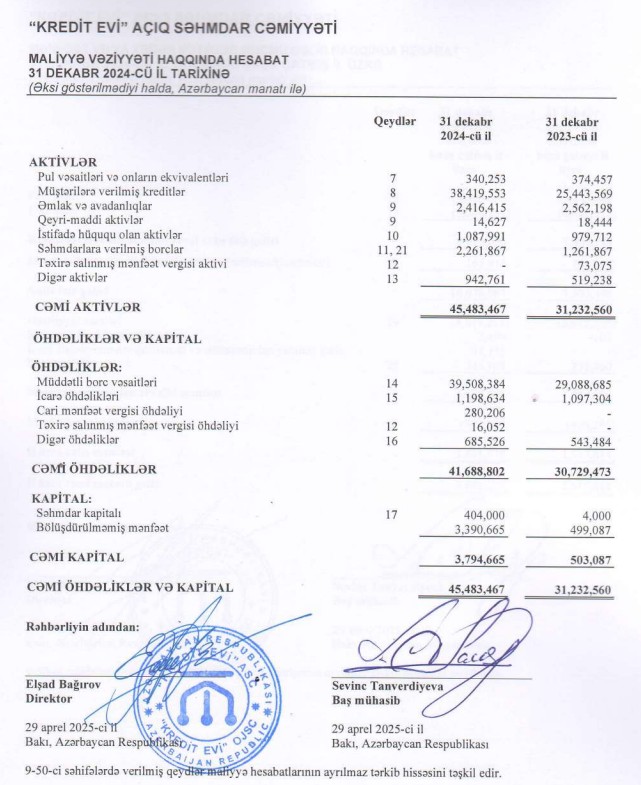 Ötən il "Kredit Evi" kredit portfeli (müştərilərə verilmiş cəmi kreditlər) 12 milyon 977 min manat və ya 51% (1,5 dəfə) artaraq 31 dekabr 2024-cü il tarixində 38 milyon 420 min manata çatıb.