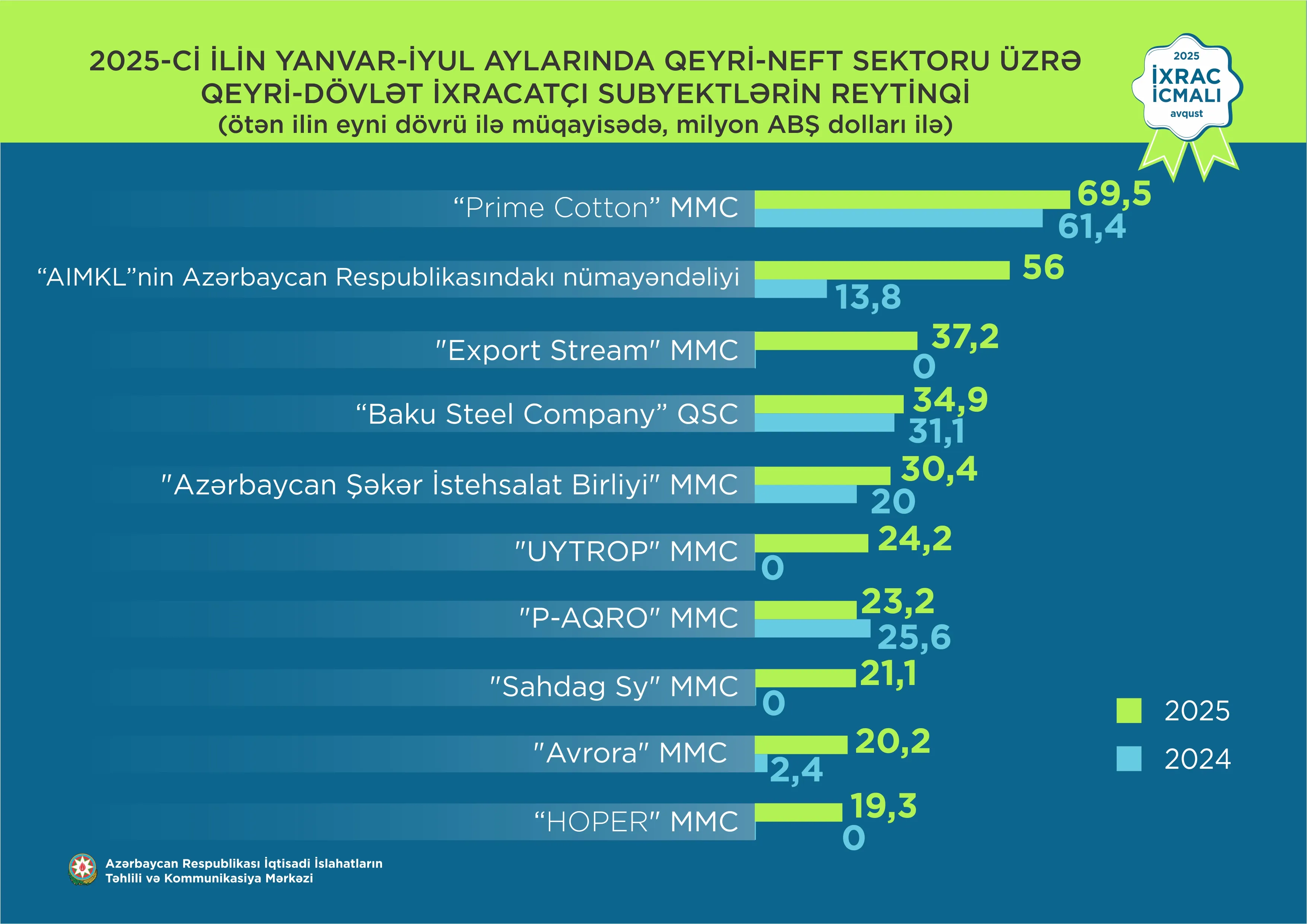 "Avrora" şirkəti 2025-ci ilin yanvar-iyul ayları üzrə hazırlanmış qeyri-dövlət ixracatçı subyektlərin reytinqində ilk onluqda 9-cu yeri tutub.