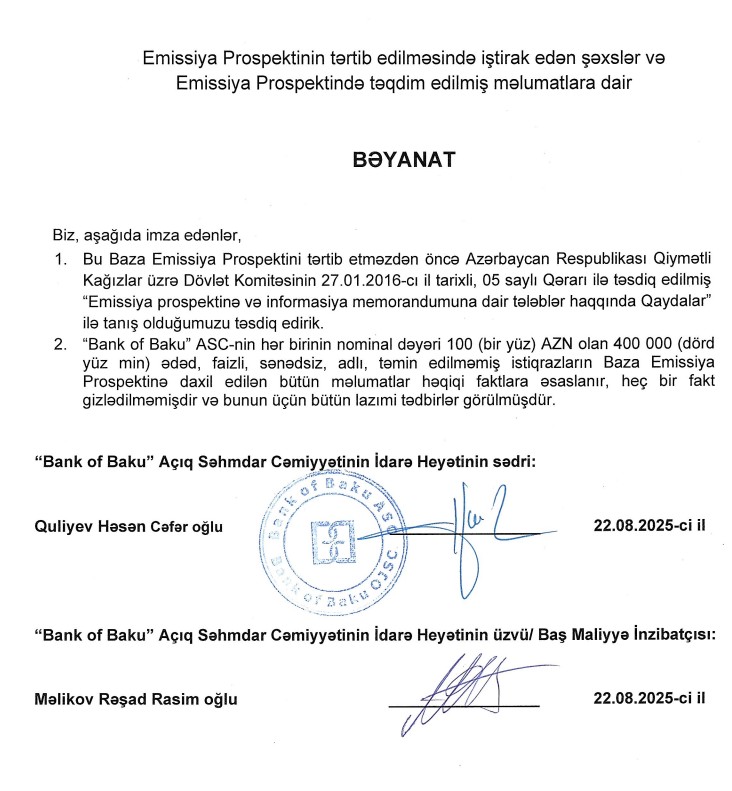Marja.az Emissiya Prospektinə istinadən xəbər verir ki, Bank hər birinin hər birinin nominal dəyəri 100 manat olan 400 000 ədəd faizli, sənədsiz, adlı, təmin edilməmiş istiqrazlar buraxır.