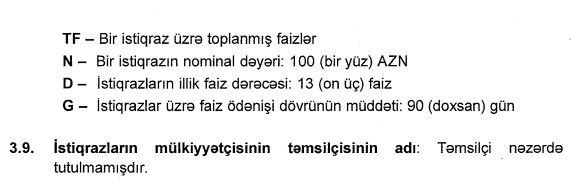 Tədavül müddəti 18 ay olan istiqrazların illik faiz dərəcəsi 13 faiz (ilk 20 milyon manatlıq yerləşdirmə üzrə), istiqrazlar üzrə faiz ödənişi dövrünün müddəti 90 gündən birdir.