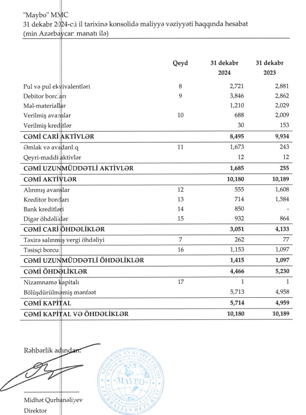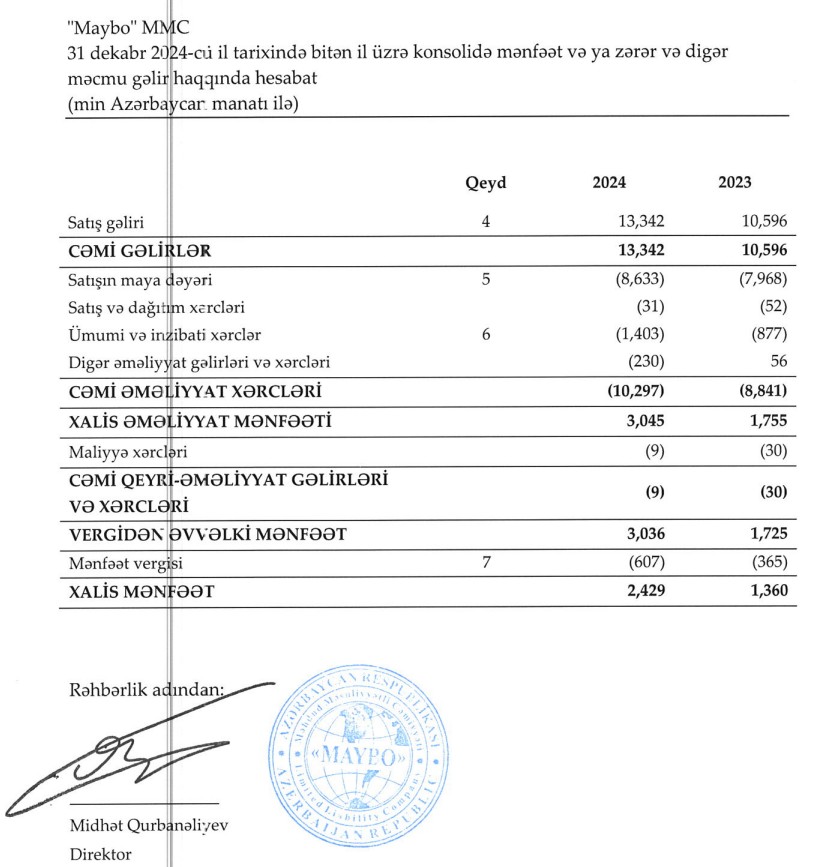 Sınaq və ölçmə cihazlarının satışı, kalibrləmə və təmir xidmətləri göstərən "Maybo" МMС 2024-cü ili 2 milyon 429 min manat xalis mənfəət ilə bağlayıb. Şirkət 2023-cü ili 1 milyon 360 min manat xalis mənfəət ilə bağlamışdı. Beləliklə, "Maybo" şirkətinin xalis mənfəəti 2024-cü ildə 2023-cü illə müqayisədə 1 milyon 69 min manat və ya 78,6% artıb.