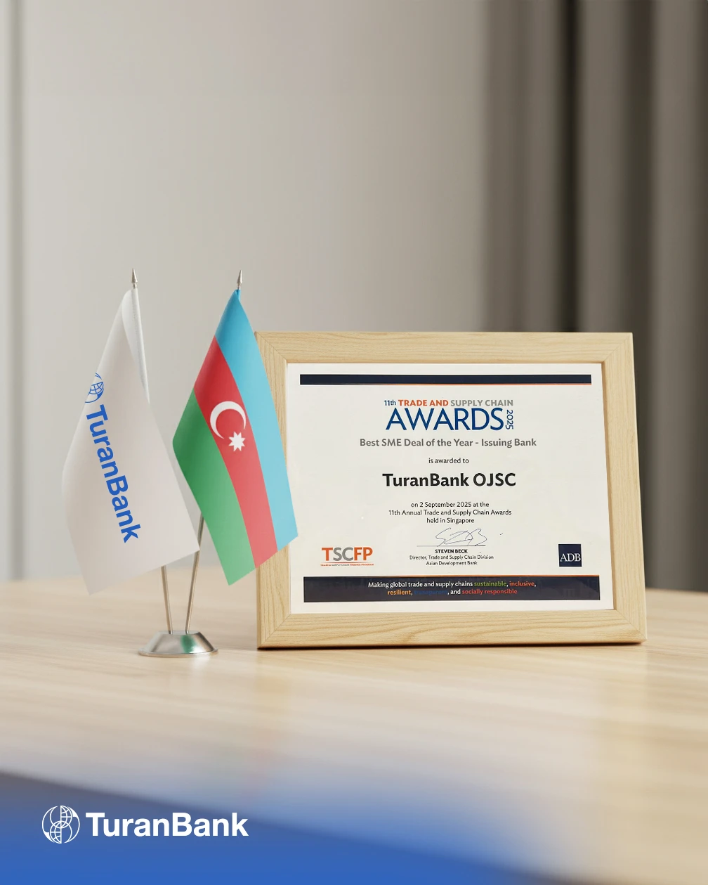 Azərbaycanın aparıcı maliyyə institutlarından biri olan TuranBank, Asiya İnkişaf Bankı (ADB) tərəfindən təşkil olunan və beynəlxalq maliyyə sektorunda yüksək nüfuza malik olan “11-ci Ticarət və Təchizat Zəncirinin Maliyyələşdirilməsi Proqramı üzrə Mükafatlar – 2025” (11th Trade and Supply Chain Finance Program Awards 2025) çərçivəsində “Ən Yaxşı KOS Maliyyələşməsi Layihəsi” (Best SME Deal of the Year) nominasiyasının qalibi elan edilib.
