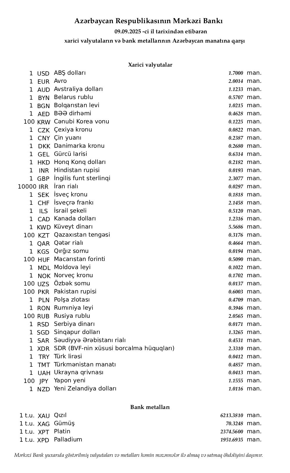 Mərkəzi Bank valyutalar üzrə rəsmi məzənnələri açıqladıRəsmi məzənnələr açıqlandı