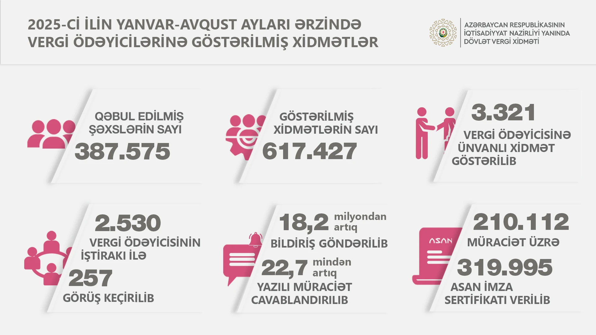 2025-ci ilin yanvar-avqust ayları ərzində vergi ödəyicilərinə xidmət mərkəzlərində ümumilikdə 387.575 şəxs qəbul edilib, onlara 617.427 sayda xidmət göstərilib ki, bunun da 215,7 mindən çoxu şifahi xidmət (müraciət etmiş şəxslərin vergi qanunvericiliyi və inzibatçılığı ilə əlaqədar suallarının cavablandırılması), 140,8 mindən çoxu elektron xidmət (bəyannamələrin və hesabatların, habelə müxtəlif ərizələrin tərtibatına və elektron formada göndərilməsinə köməklik göstərilməsi) olub.