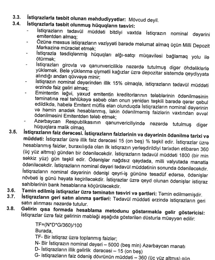 İstiqrazlar üzrə illik gəlirlilik dərəcəsi 15%-dir. Fazilər ildə 1 dəfə ödəniləcəkdir. İstiqrazların tədavül müddəti 5 il müəyyən olunub.